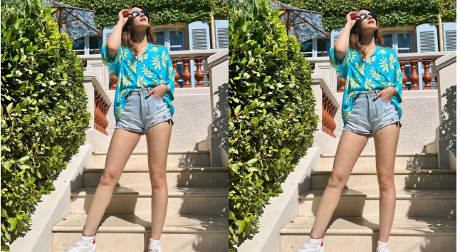 If you want a laid back yet fashionable combination, biker shorts paired with a graphic t-shirt like Alia Bhatt’s is one movie date outfit that is trendy and fashionable. Choose fabrics like spandex that provide comfort and support. Black and neutral colors are versatile, while bold colors can also make a statement. When choosing a graphic t-shirt look for bold prints to balance the biker shorts. With white sneakers and cross body bags, finish your cool look.