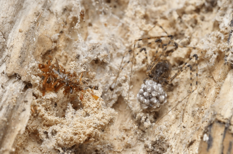 Scientists think the case might act as camouflage, allowing the caterpillar to feast on the spider’s ensnared meals without getting caught.
