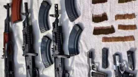 The seizure includes three AK-47 rifles along with five magazines, two pistols of Turkish and Chinese origin, two additional magazines, and 98 live cartridges.