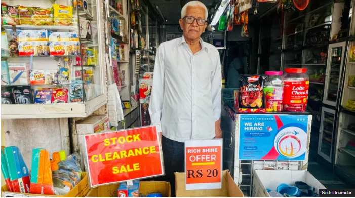 Behind him, cardboard boxes of unsold biscuit packets and snacks show a “stock clearance sale” sign posted on them.