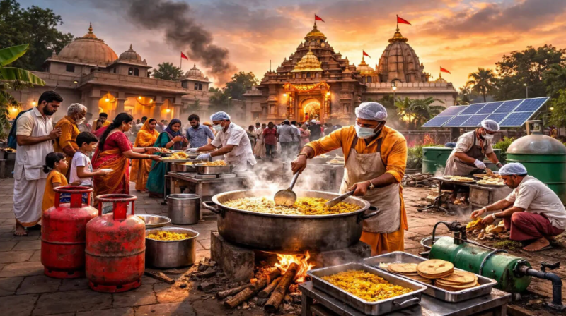 The ongoing shortage of commercial LPG cylinders in India, caused by energy supply disruptions from the Gulf, is impacting temples and religious institutions. Many have limited food offerings or sought alternative energy sources.