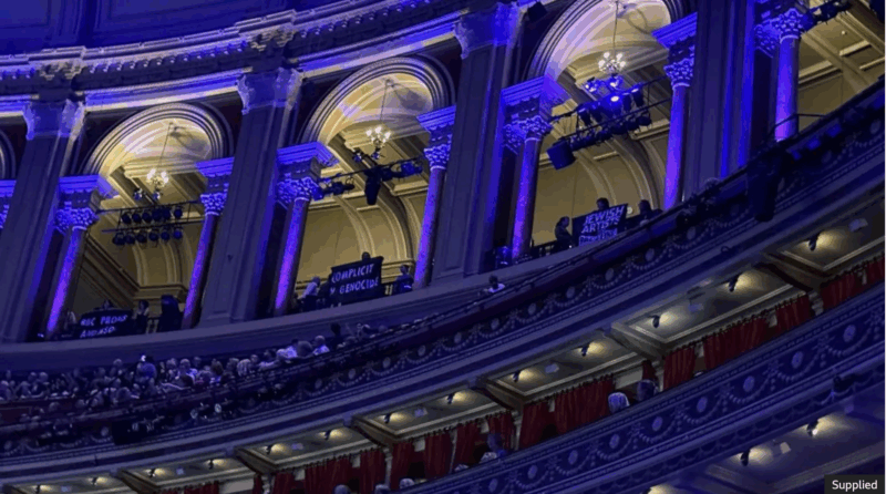In a video posted online by a pro-Palestinian group linked to the protesters, people can be seen standing in the upper gallery of the Royal Albert Hall holding black handwritten fabric signs reading “complicit in genocide” and “Jewish Artists for Palestine”.