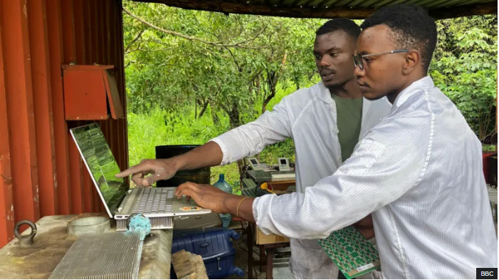 But there’s another sound cutting through the trees of the Zambian bush – the unmistakable high-pitched whine of a bitcoin mine.