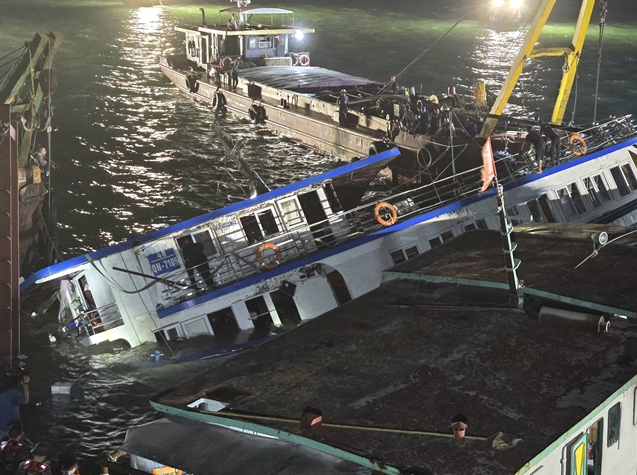 Pictures from the scene show stormy skies as rescue boats surround the capsized vessel – with divers in the water scrambling to find survivors.
