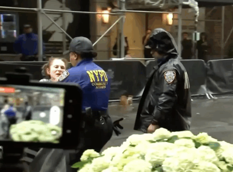 In the video, it appears that NYPD officers and security are trying to keep her from one entrance of the hotel — and she then attempts to barge into another door when two cops forcibly grab her and haul her away.
