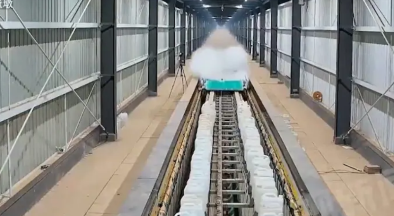 Footage aired by China’s state broadcaster CCTV showed the test vehicle—appearing as a streamlined chassis—racing along the track at high speed, briefly visible as a blur and leaving smoke in its wake.