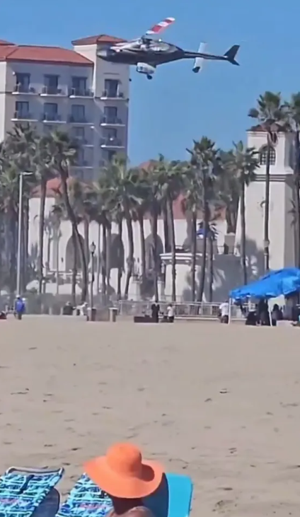 In a video captured by an onlooker, the chopper can be seen hovering next to a row of flats at Huntington Beach, California.