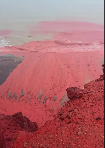 These minerals mix with the heavy tide to give the shoreline a bright red colour, which looks as if someone has dropped a large bucket or red paint in the sea.