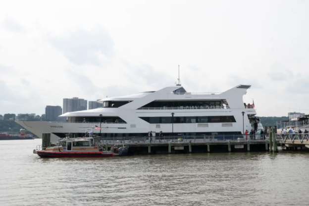 The three-story vessel, the largest within the Empire Cruises’s charter fleet, is equipped with three bars, a climate controlled indoor seating area that holds up to 550 passengers for trips along the Hudson River, according to its website.