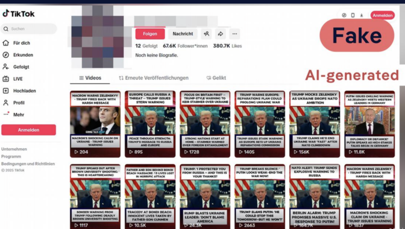 The TikTok account that posted the video of Merz has what looks like an AI-generated profile image, and the profile name includes a string of numbers, typical indicators that it is part of a content farm.