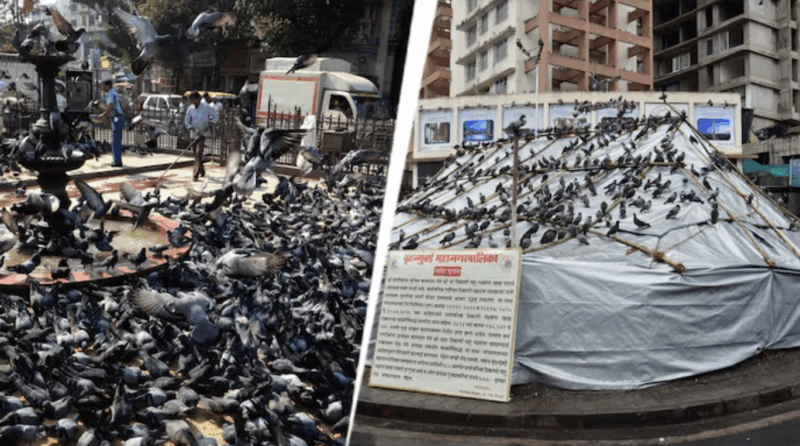 The Kabootarkhana, a landmark in Dadar where thousands of pigeons were fed daily, primarily by Jains, was covered with grey tarpaulin to prevent birds from roosting. Following the ban, community members have continued to feed pigeons near the spot.