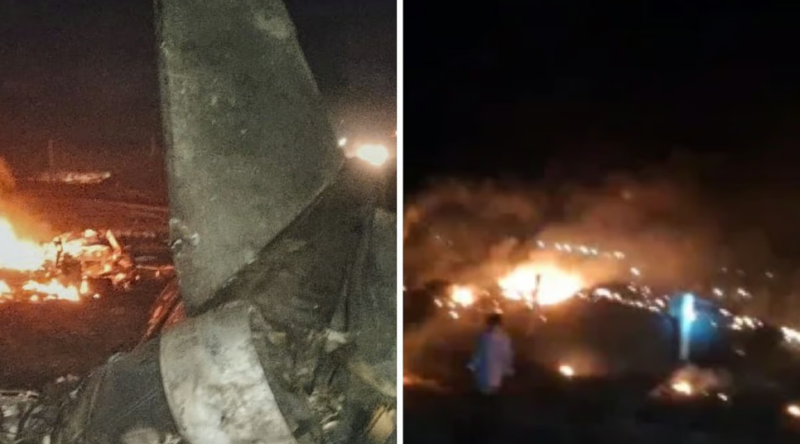Footage circulating on social media showed the crash site engulfed in flames, with debris scattered over a vast area. The cockpit and tail section of the aircraft were spotted separately, consumed by fire.