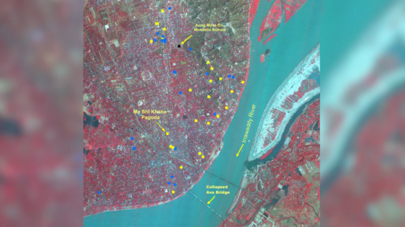 As seen from the imagery, the earthquake led to the collapse of the historic Ava (InnWa) Bridge on the Irrawaddy River, near Inn Wa City. Cracks in flood plains of the Irrawaddy river with associated liquefaction were also observed.