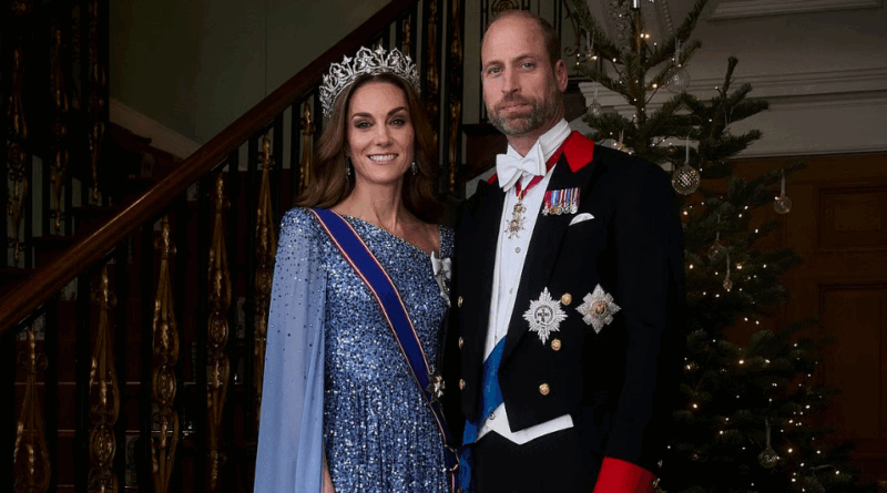 Kate chose a shimmering blue cape-style gown by Jenny Packham, a designer she often relies on for high-profile royal events. The dress featured a full sequin finish that complemented the grandeur of the evening.