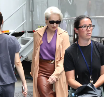 Streep was snapped filming in New York City, rocking her character’s signature icy white long pixie cut. The actress looked chic in a long tan trench coat, a purple blouse tucked into a belted brown leather skirt and matching brown heels.