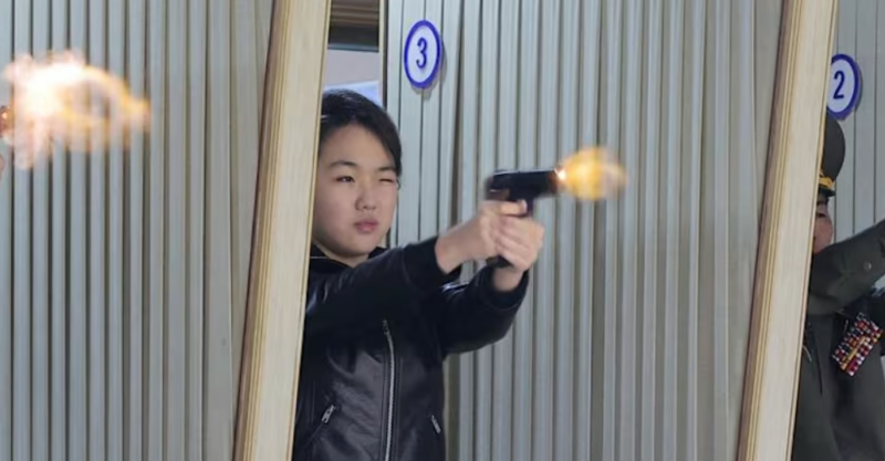 Pyongyang’s state media released an image of Ju Ae firing what looked like a pistol with one eye closed, flames shooting from the muzzle of the gun.
