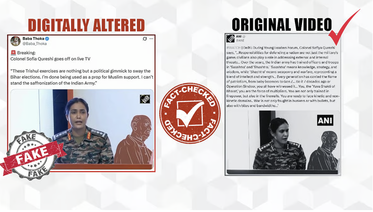 A video is making rounds on social media in which Colonel Sofia Qureshi is seen alleging saffronisation of the Indian Army and claiming that Trishul exercises are nothing but a political gimmick to sway the Bihar elections. The video which is being widely circulated on social media is deepfake and shared by Pakistani propaganda accounts. PIB fact checked the video and said that the video is digitally altered and the claims being made in the video are false.