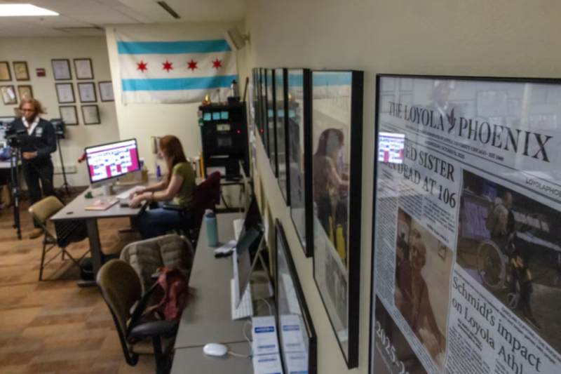 The windowless newsroom of The Phoenix, the Loyola University Chicago newspaper, hums like an old refrigerator. A coffee pot burbles in the corner as juniors Julia Pentasuglio and Ella Daugherty lean over a glowing laptop, updating a Google map.
