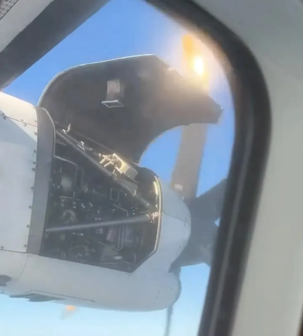 Terrifying footage taken from inside the plane shows the panel flapping dangerously – just inches away from the propeller.
