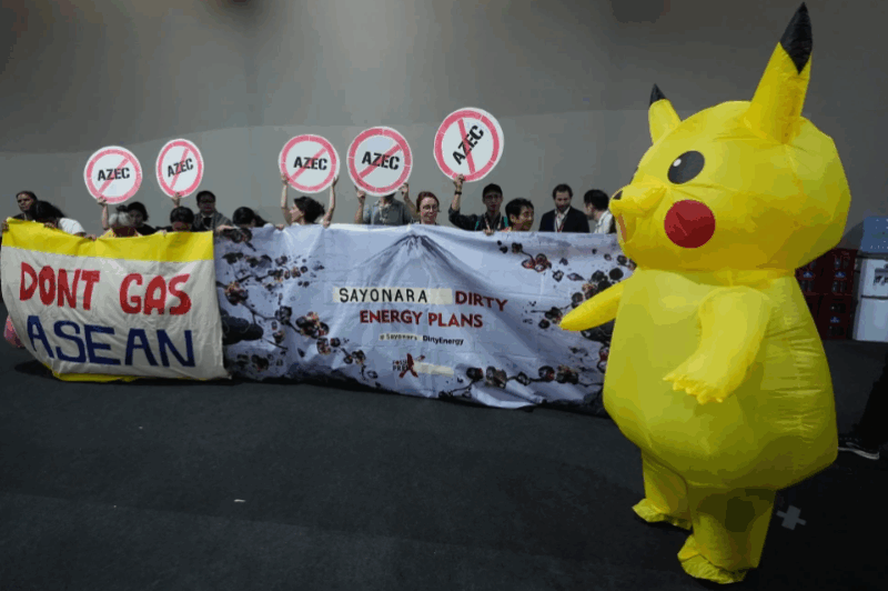 The event included activists from across the Association of Southeast Asian Nations (ASEAN), which is home to multiple Japan-backed fossil fuel projects. One banner read: “Don’t gas ASEAN.” Ian Rivera, national coordinator at Philippine Movement for Climate Justice, led chants of “Only Pokemon, no fossil fuels” and “Sayonara fossil fuels.”