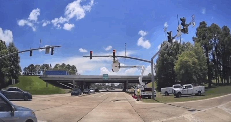 Shocking dashcam footage captures the worker, strapped into a bucket lift, get violently hit while fixing a traffic light in Denham Springs.