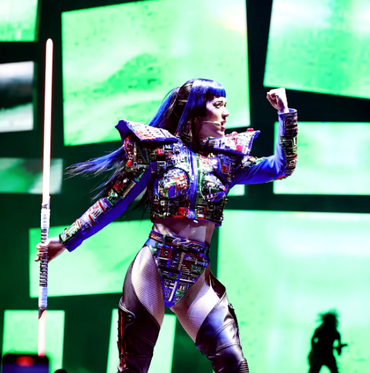 In a minute-long clip shared on TikTok, Perry backed up to the audience to shake her rear end, cheekily lay on the stage to raise one leg in the air and listlessly performed what appeared to be robot-inspired moves to her song “Part of Me” in a space-age cone bra and thigh-high boots.