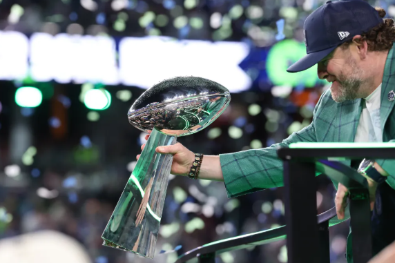 Seattle Seahawks lifts the most-coveted trophy, the Lombardi Trophy.