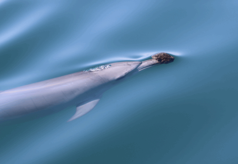 Using the sponge to protect from sharp rocks, the dolphins swim with their beaks covered, shoveling through rubble at the bottom of sandy channels and stirring up barred sandperch for a meal.