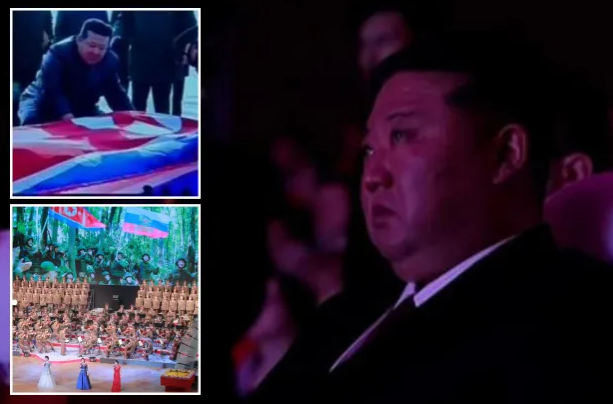 Images of Kim draping the North Korean flag over soldiers’ coffins were broadcast on a giant screen at the front while a huge orchestra played emotional music.