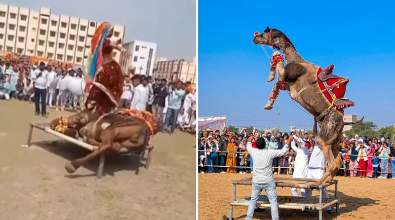 A viral video from Rajasthan circulating online shows a woman dancing atop the animal, which was placed on a raised platform under the scorching sun. The camel’s legs appeared to be tied, restricting its movement while a crowd watched in silence.