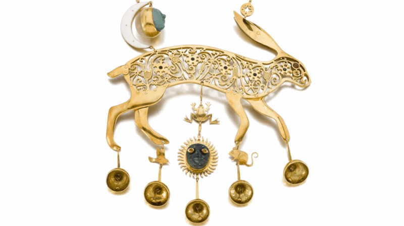The golden hare, given the name Jack, is set with a ruby eye and a body design that includes flowhead motifs, each set with turquoise.