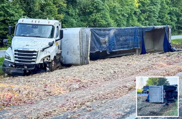 The impact caused the truck to flip, dumping its load of dead chickens onto the interstate.