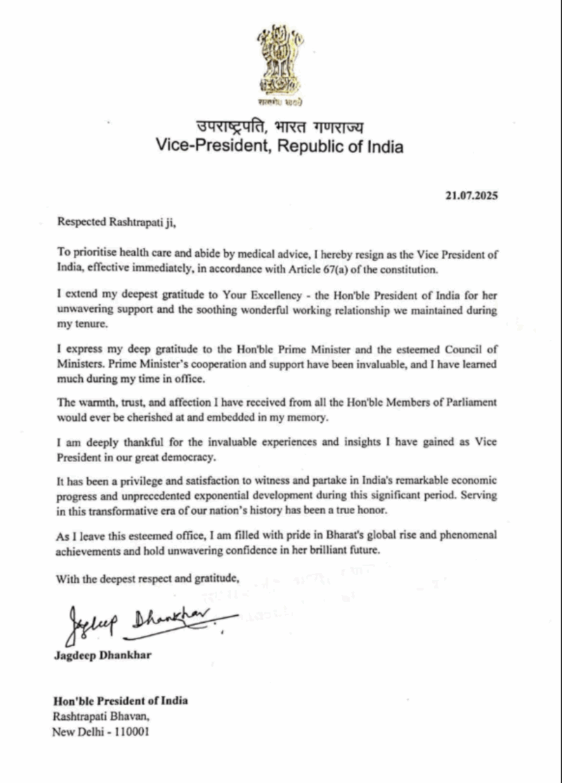 “To prioritise health care and abide by medical advice, I hereby resign as the Vice President of India, effective immediately, in accordance with Article 67(a) of the Constitution,” Dhankhar said in a letter addressed to President Droupadi Murmu. The letter was released by the Vice President’s Office.