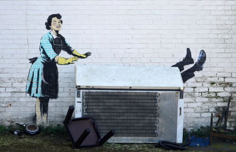 Sam became the custodian of Valentine’s Day Mascara, which speaks to the theme of domestic violence, incidents of which usually spike each Valentine’s Day. It’s a complicated bit of work. A peppy 50s housewife with a black eye has bludgeoned her partner. A real pan with flecks of red is at her feet, and his painted legs are upended into the real fridge-freezer that Banksy left by the wall. A broken plastic chair testifies to the fight they have had.
