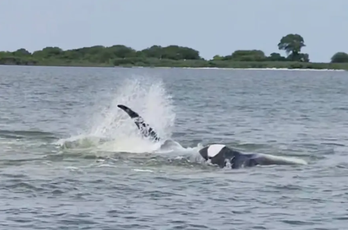The incident went down Sunday off in Barnegat Bay in New Jersey, when a small motor boat came across a minke that was seen thrashing in shallow waters.