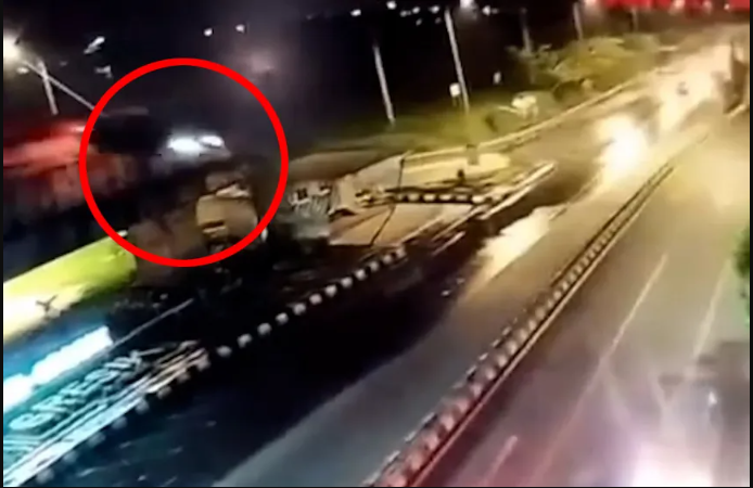 CCTV footage shows the BMW flying over the bridge, slamming bumper-first onto the pavement and nearly flipping into oncoming cars.